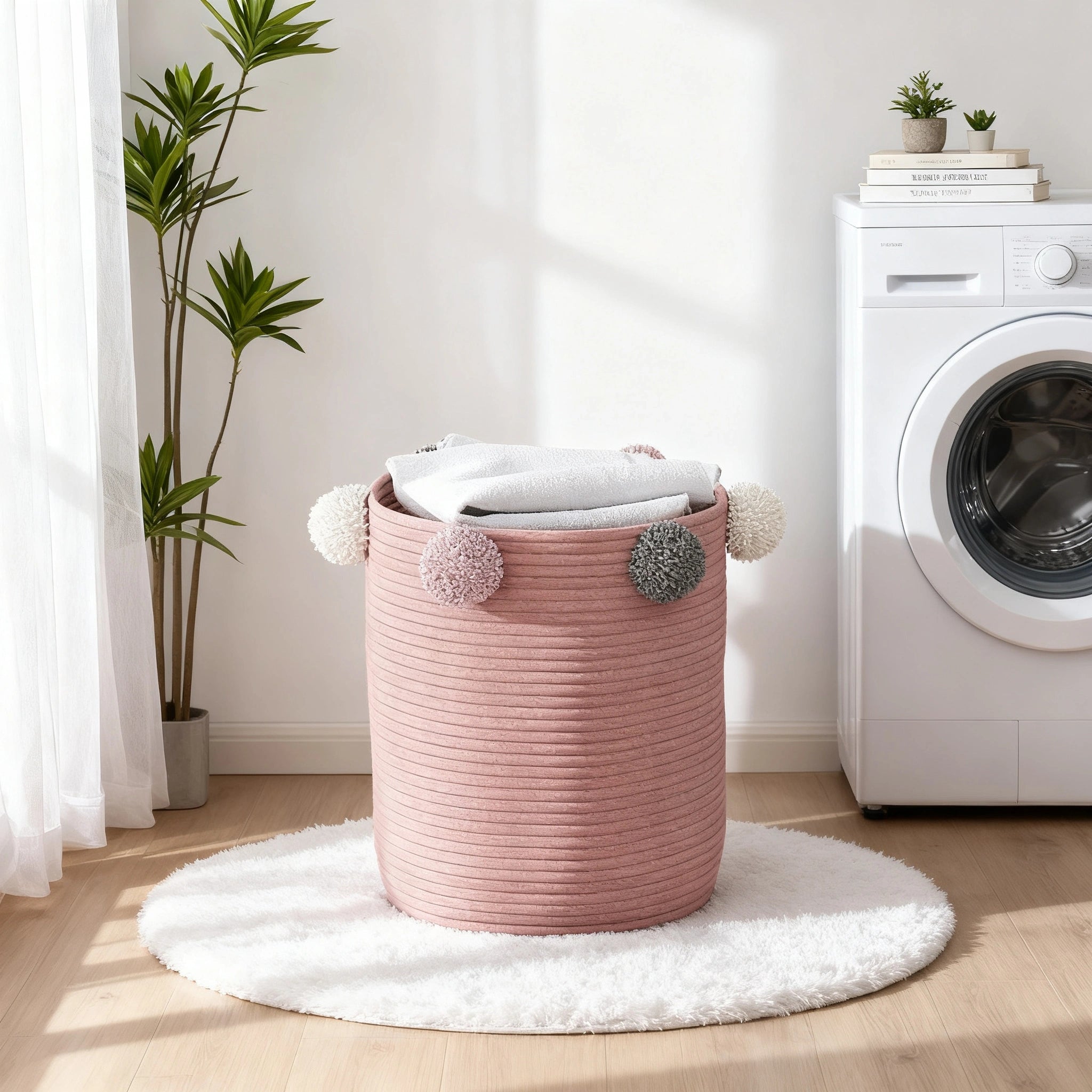 Woven Cotton Rope Storage Basket with Pom-Poms – Soft & Foldable Organizer for Laundry, Toys, Blankets