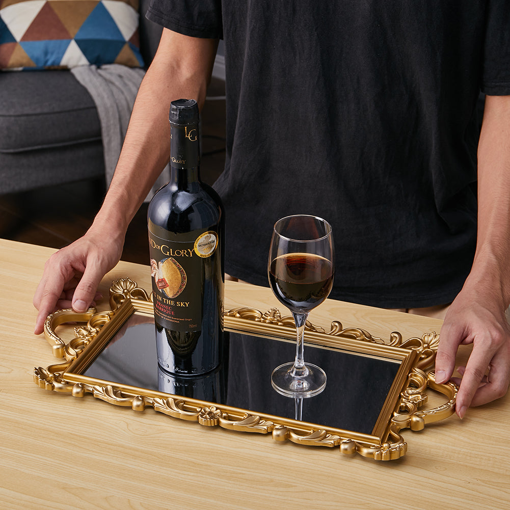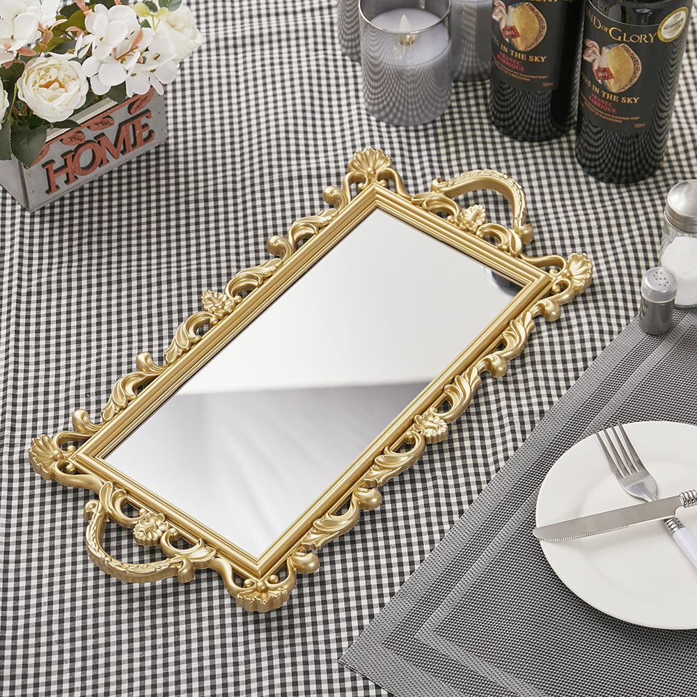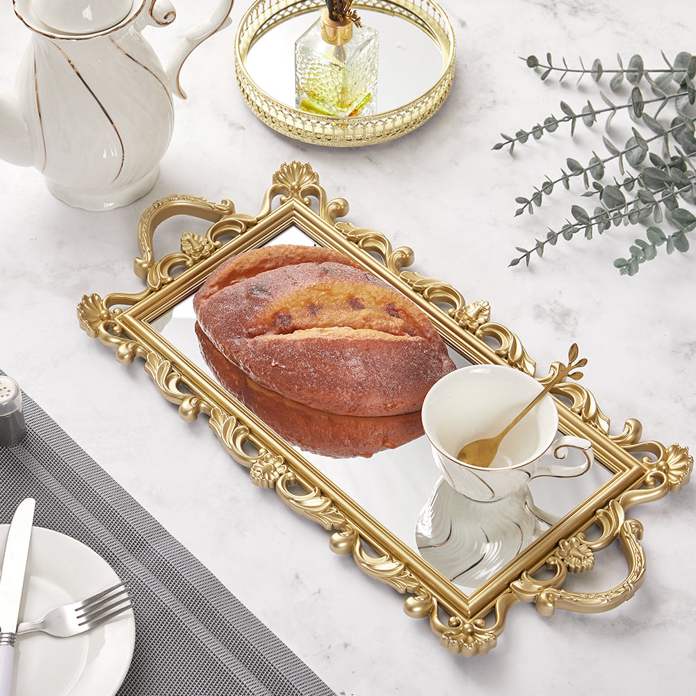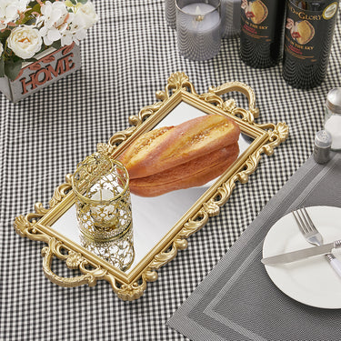 Elevate your serving experience with the Lifeideas mirror base serving tray, featuring a stunning gold-toned frame adorned with delicate, artistic patterns. The reflective mirrored surface not only adds a touch of sophistication but also brightens your space by bouncing light and creating a sense of openness. The beautifully designed hollow-out border blends classic elegance with modern minimalism, making this tray a versatile piece that complements a wide range of interior styles.